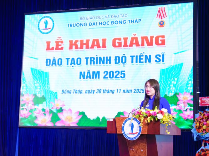The program was honored to welcome Dr. Nguyen Trong Minh Khanh – President of the Economic and Education Development Union; MA. Nguyen An Nhien – Secretary of the Economic and Education Development Union. From Dong Thap University, attendees included Dr. Truong Tan Dat – Party Committee Secretary, Chairman of the University Council; Assoc. Prof. Dr. Ho Van Thong – Rector; Assoc. Prof. Dr. Nguyen Van De – Chairman of the Science and Technology Council, Head of Educational Management Major; Assoc. Prof. Dr. Ho Sy Thang – Vice Rector, along with many lecturers, administrators, more than 100 students, doctoral candidates, their families and friends.