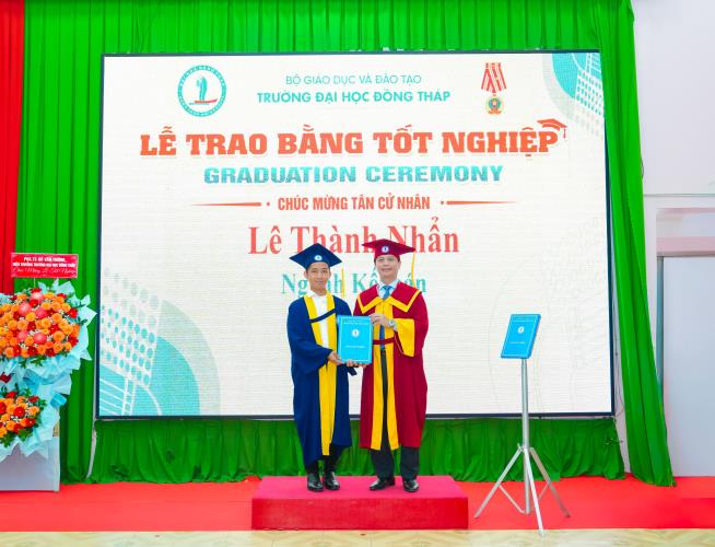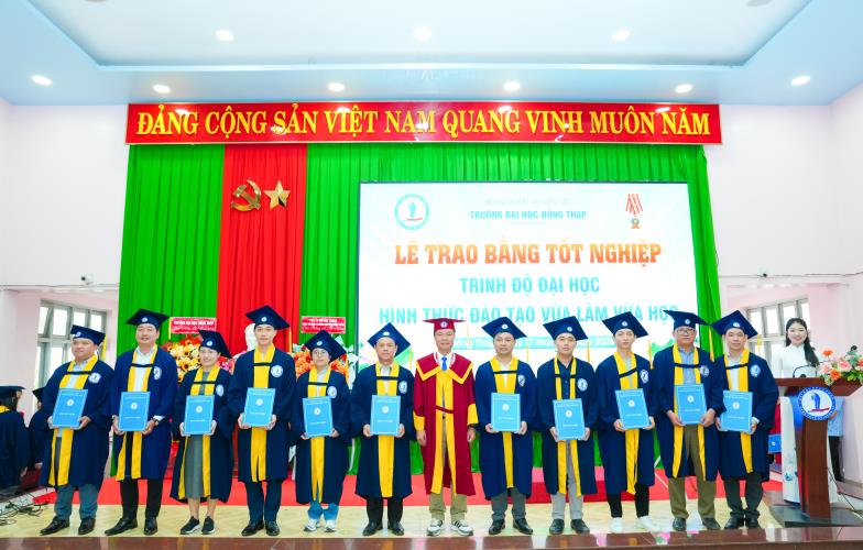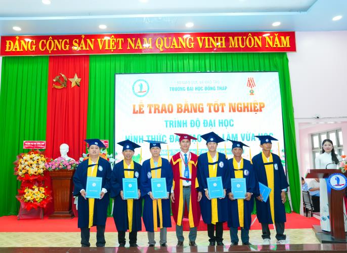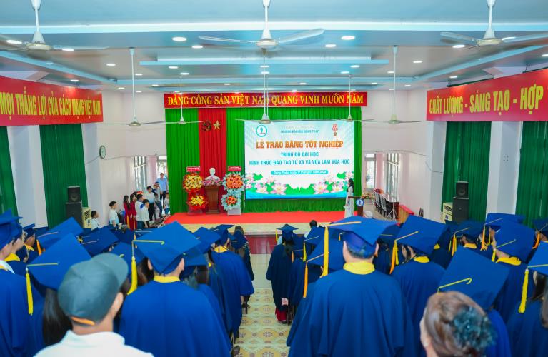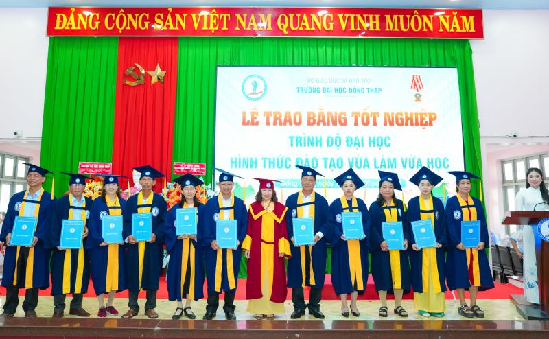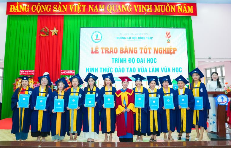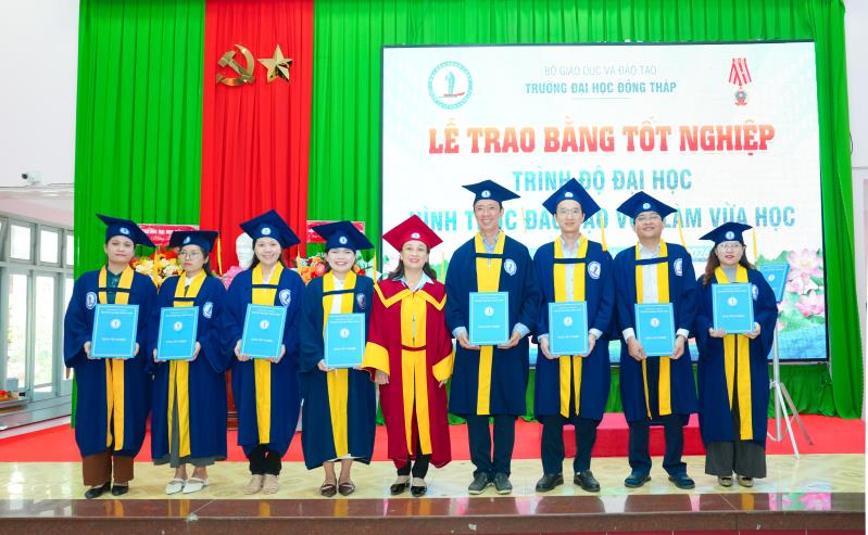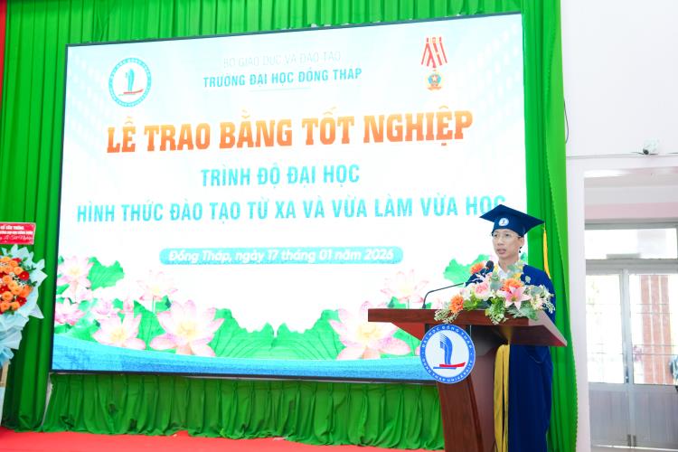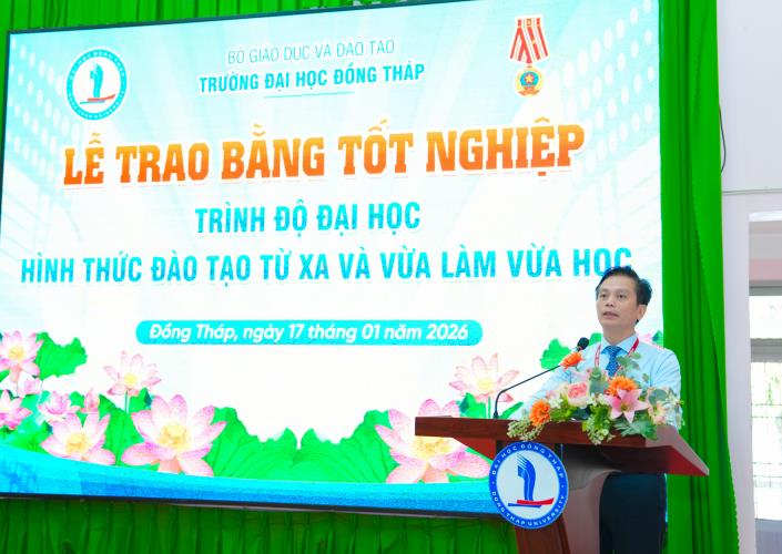 Speaking at the ceremony, Dr. Nguyen Quoc Vu – Vice Rector of Dong Thap University – emphasized that the University always places learners at the center of all training activities; continuously innovates teaching content and methods; promotes the application of information technology; and enhances the quality of lecturers for distance learning and part‑time programs. The University consistently accompanies and supports learners throughout their studies, helping them complete their programs on schedule and meet the required learning outcomes, thereby affirming the quality and effectiveness of its training efforts.