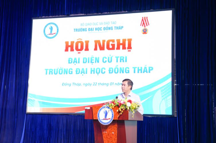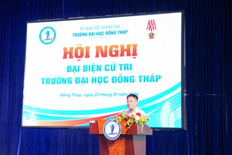 Speaking at the Conference, Assoc. Prof. Dr. Ho Van Thong – Deputy Secretary of the Party Committee, Rector of the University – on behalf of the University’s leadership, delivered guidance and orientation. At the same time, he introduced Dr. Truong Tan Dat – Secretary of the Party Committee – to participate as a candidate for the Dong Thap Provincial People’s Council for the 2026–2031 term.