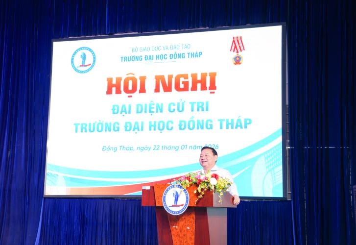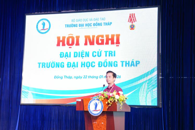At the Conference, MA Cao Dao Thep, Senior Lecturer – Permanent Deputy Secretary of the Party Committee, Vice Rector – presented the submission of the University’s leadership regarding the number, structure, composition, criteria, conditions, and personnel list proposed for nomination to the Dong Thap Provincial People’s Council for the 2026–2031 term.