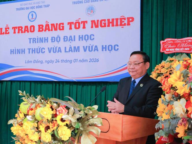 Speaking at the ceremony, Assoc. Prof. Dr. Ho Van Thong – Rector of Dong Thap University – congratulated the students on completing the part‑time undergraduate program. The University leadership acknowledged the learners’ serious study attitude, perseverance, and sense of responsibility throughout the process of balancing work and study. He also highly appreciated their efforts in managing time effectively, meeting academic requirements, and completing the program as prescribed.
