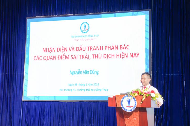 On January 29, 2026, the Ho Chi Minh Communist Youth Union (HCYU) and Viet Nam Union of Students (VUS) of Dong Thap University jointly organized a thematic seminar titled “Identifying and Countering Wrongful and Distorted Views Spread by Hostile Forces in the Current Context,” with the participation of nearly 400 HCYU–VUS officers, HCYU members, and students.