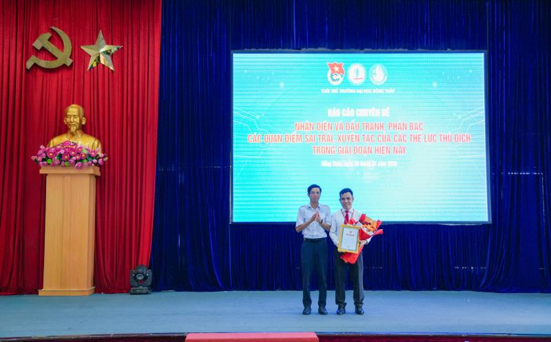 The program was honored to welcome Assoc. Prof. Dr. Nguyen Van Dung – Member of the Standing Committee, Head of the Propaganda and Mass Mobilization Committee of the Party Committee of Dong Thap University, Secretary of the Party Committee, and Dean of the School of Education – who directly delivered the thematic report. The seminar focused on clarifying common distortion tactics; methods of identification and counter‑argument; and orienting the roles and responsibilities of students in communication efforts and in safeguarding the ideological foundation of the Party. At the end of the session, students who participated and completed the required reflection assignment received an electronic certificate, which contributes to their qualification for the “Student with 5 good criteria” title at the university level for the 2025–2026 academic year.