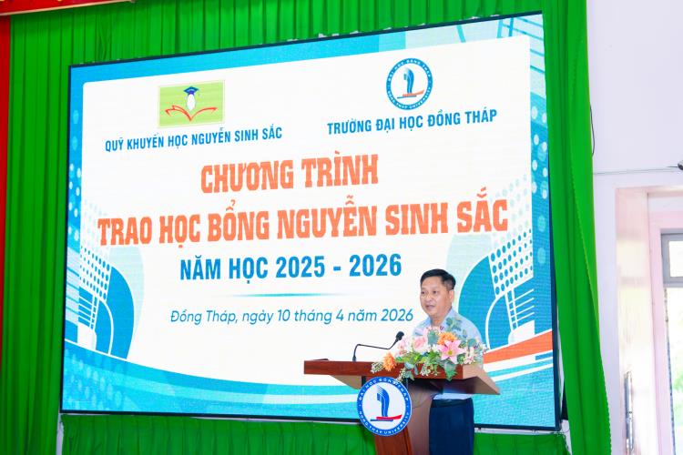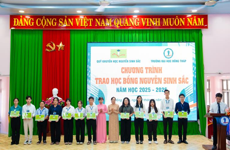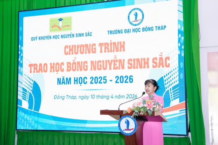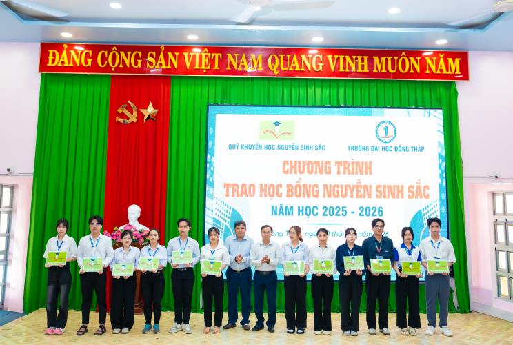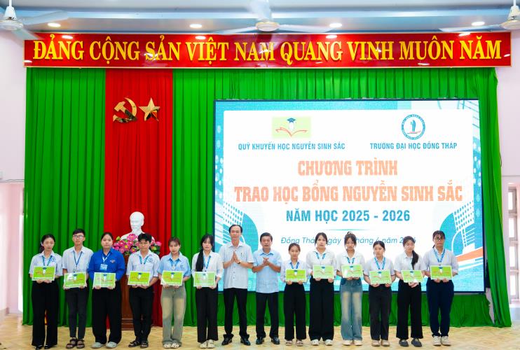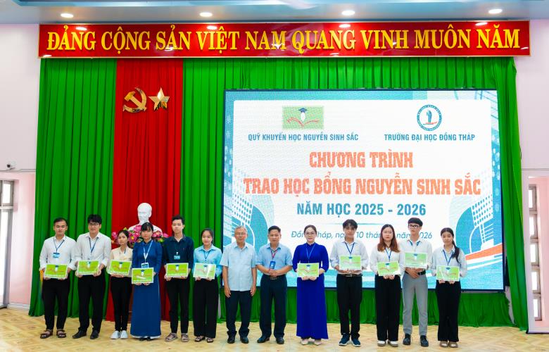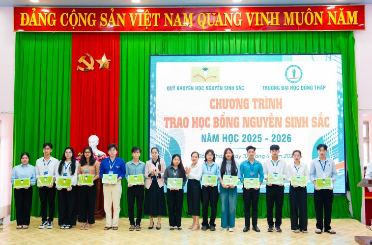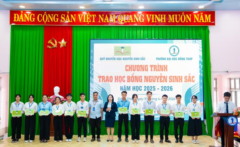 On April 10, Dong Thap University, in collaboration with the Nguyen Sinh Sac Scholarship Fund, held the 2025–2026 Nguyen Sinh Sac Scholarship Award Ceremony for students facing difficult circumstances and achieving strong academic results. These scholarships carry practical meaning, providing motivation for students to strive in their studies and personal development.